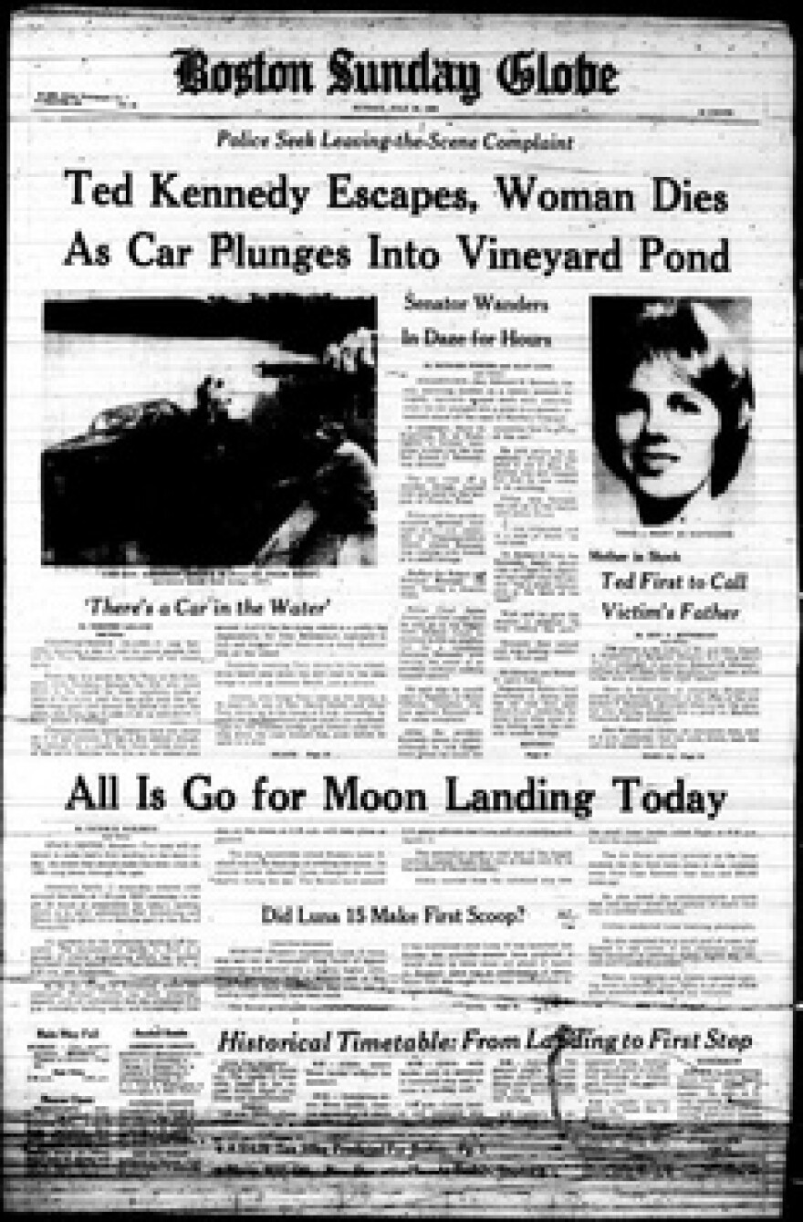 • 1969 --- Shortly after leaving a party on Chappaquiddick Island, Senator Edward "Ted" Kennedy of Massachusetts drives an Oldsmobile off a wooden bridge into a tide-swept pond. Kennedy escaped the submerged car, but his passenger, 28-year-old Mary Jo Kopechne, did not. The senator did not report the fatal car accident for 10 hours. On July 25, Kennedy pleaded guilty to leaving the