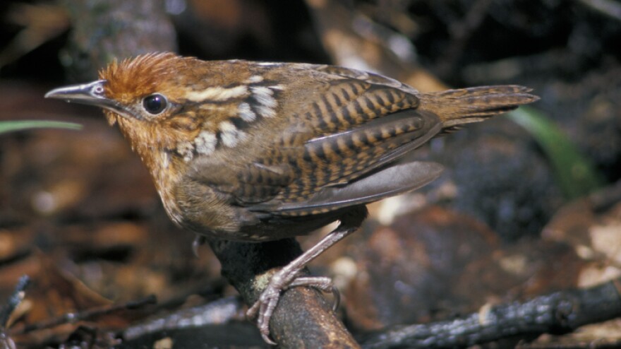 In compiling such a vast collection, Budney has hit upon a few favorites — like the tuneful call of the musician wren, a small brown bird found throughout the Amazon region. "It walks along the forest floor," Budney says, "flipping over leaves looking for insects."