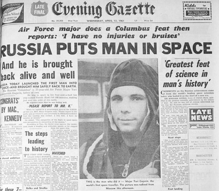 - 1961 --- Aboard the spacecraft Vostok 1, Soviet cosmonaut Yuri Alekseyevich Gagarin becomes the first human being to travel into space. During the flight, the 27-year-old test pilot and industrial technician also became the first man to orbit the planet, a feat accomplished by his space capsule in 89 minutes. Vostok 1 orbited Earth at a maximum altitude of 187 miles and was guided entirely by an automatic control system. The only statement attributed to Gagarin during his one hour and 48 minutes in space was, "Flight is proceeding normally; I am well." After his historic feat was announced, the attractive and unassuming Gagarin became an instant worldwide celebrity. He was awarded the Order of Lenin and given the title of Hero of the Soviet Union. Monuments were raised to him across the Soviet Union and streets renamed in his honor.
