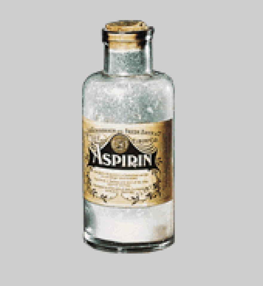 - 1899 --- The Imperial Patent Office in Berlin registers Aspirin, the brand name for acetylsalicylic acid, on behalf of the German pharmaceutical company Friedrich Bayer & Co. Now the most common drug in household medicine cabinets, acetylsalicylic acid was originally made from a chemical found in the bark of willowtrees. In its primitive form, the active ingredient, salicin, was used for centuries in folk medicine, beginning in ancient Greece when Hippocrates used it to relieve pain and fever. Known to doctors since the mid-19thcentury, it was used sparingly due to its unpleasant taste and tendency to damage the stomach.
