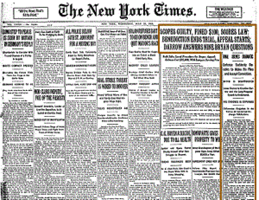 - 1925 --- Schoolteacher John T. Scopes is convicted of violating Tennessee's law against teaching evolution in public schools. The case debated in the so-called "Trial of the Century" was never really in doubt; the jury only conferred for a few moments in the hallway before returning to the courtroom with a guilty verdict. Nevertheless, the supporters of evolution won the public relations battle that was really at stake. (The conviction was later overturned.)