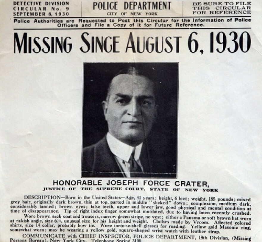 - 1930 --- New York Supreme Court judge Joseph Force Crater vanished on the streets of Manhattan near Times Square. The dapper 41-year-old’s disappearance launched a massive investigation that captivated the nation, earning Crater the title of “the missingest man in New York.”