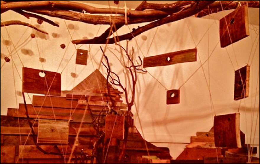 In the interest of firm footing, let's first approach Momentum Still, a group installation now at headquarters gallery, by way of literal description. First observation: Ornately patterned rugs carpet the small, downtown Berkeley storefront studio, softening the usually hard-tiled interior. Second: A wreath of tree boughs, several feet in diameter, occupies the room's middle space, suspended from the ceiling by taut twine. The wreath itself supports a loose weave of string and wood planks, suggesting a sort of reconfigured dream catcher or rustic veil. A constellation of pinecones hangs in its midst. Third: One wall is paneled with salvaged wood planks of various shapes and sizes. The nooks between their strata contain little surprises: crystals, dried moss, 'zines, dollar bills, and so on.