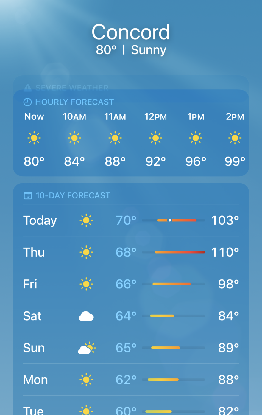 The city has also extended availability at the following designed cooling centers this week: 9 a.m. to 7 p.m. Tuesday and Wednesday at the Concord Senior Center; and 9 a.m. to 7 p.m. Thursday and Friday at the Willow Pass Community Center .