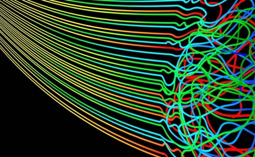 The second law tells us that in any closed system, entropy — the measure of disorder or randomness — always increases. In other words, energy spreads out. Order ultimately gives way to disorder.