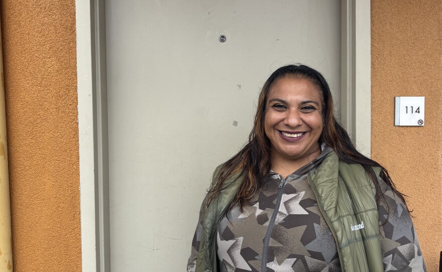 Angelina Pena outside Marcela's room at the Rodeway Inn.