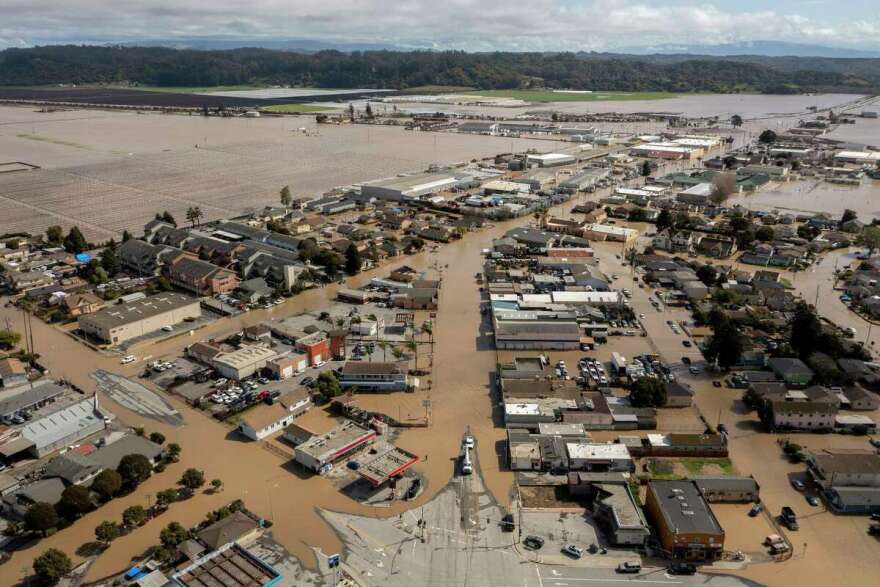 On Saturday, a levee broke along the Pajaro River in Monterey County forcing 1,700 people to flee their homes. An aerial view shows the entire area submerged in flood waters.